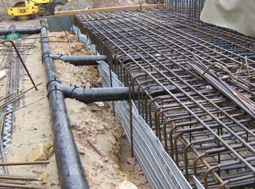 Grundleitung unterhalb der Betonbodenplatte. Aus Geberit PE-HD Rohr für höhere Anforderungen wie z.B. drückendes Wasser (Küste), Labortechnik, Säurefest, Wasserschutzgebiete, Ölabscheider etc.